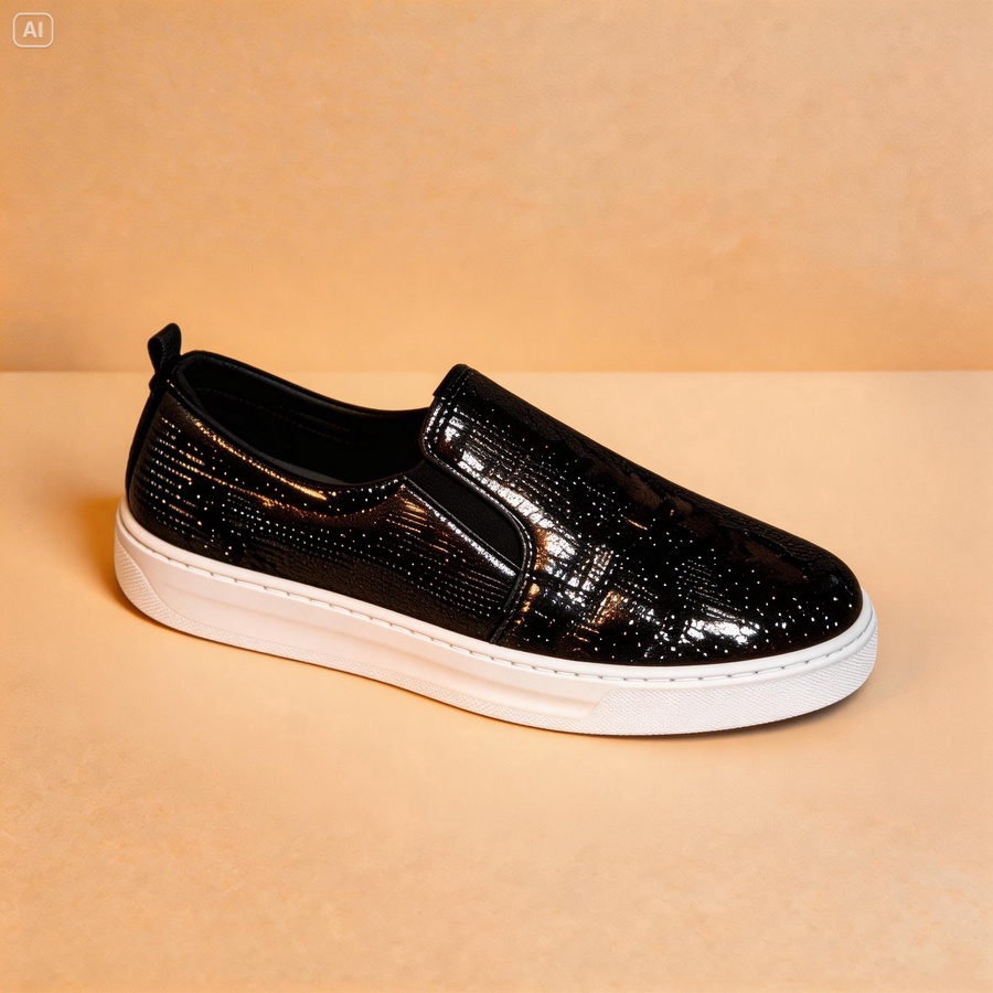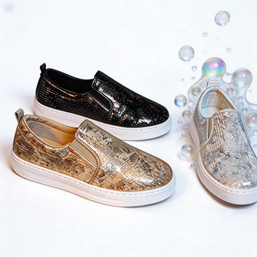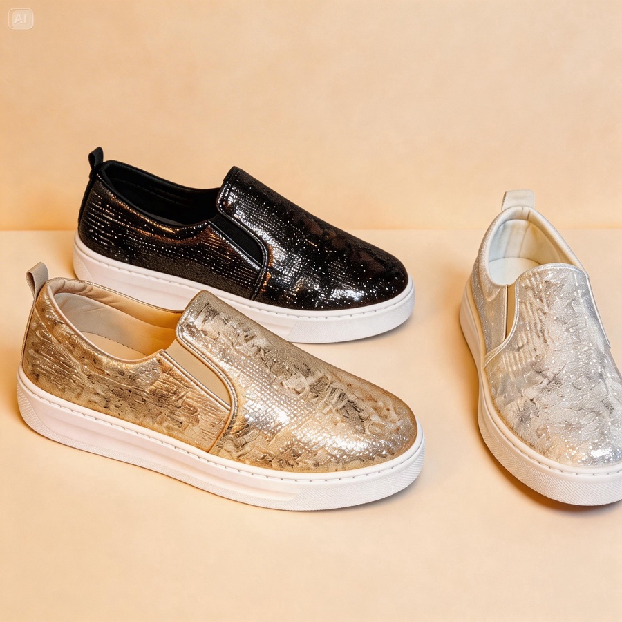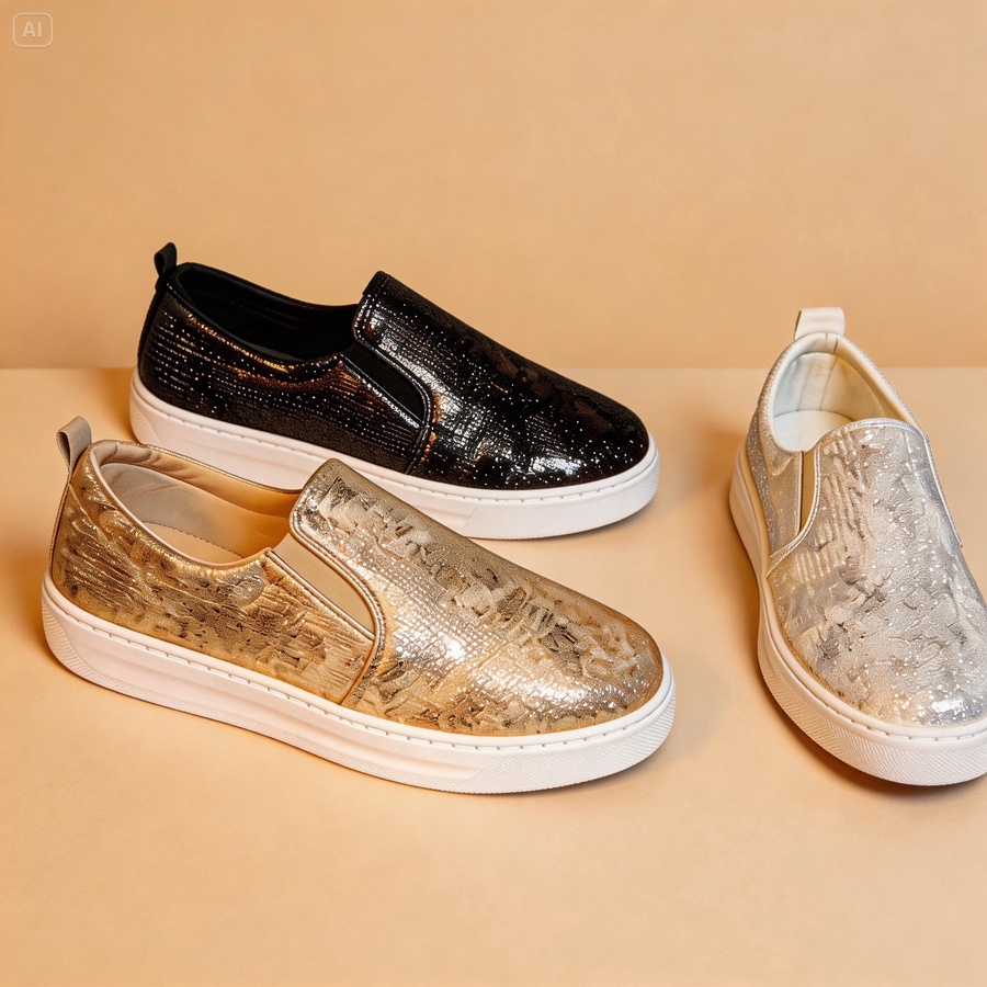 "حذاء سنيكرز سليب أون حريمي لامع من VART – مريح وأنيق للجامعة والخروج اليومي. متوفر بثلاث ألوان: أسود، ذهبي، فضي. اشتري الآن!"