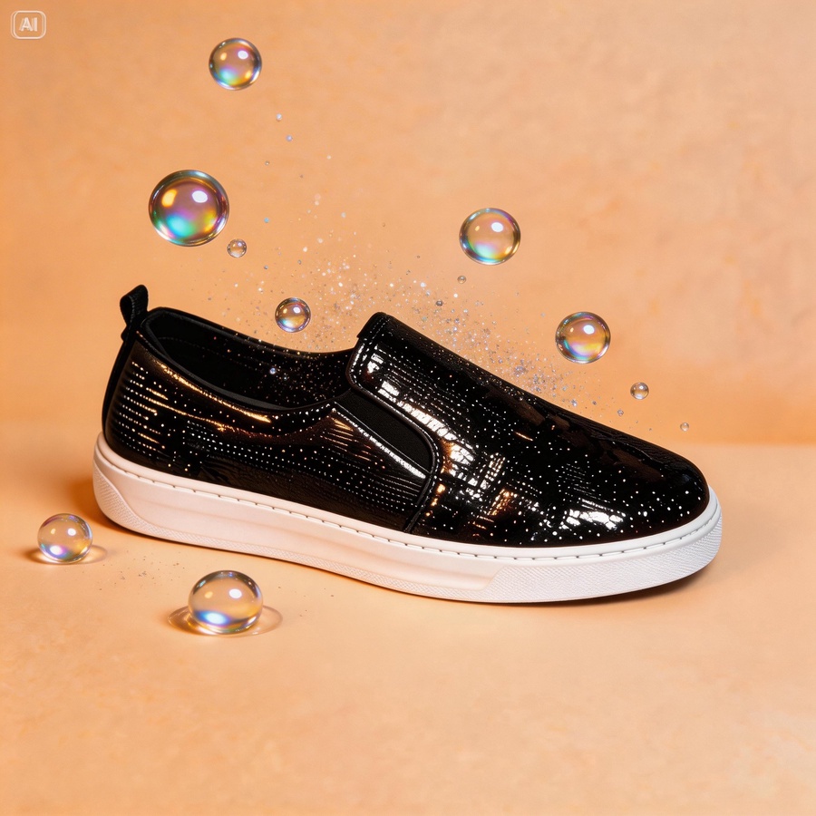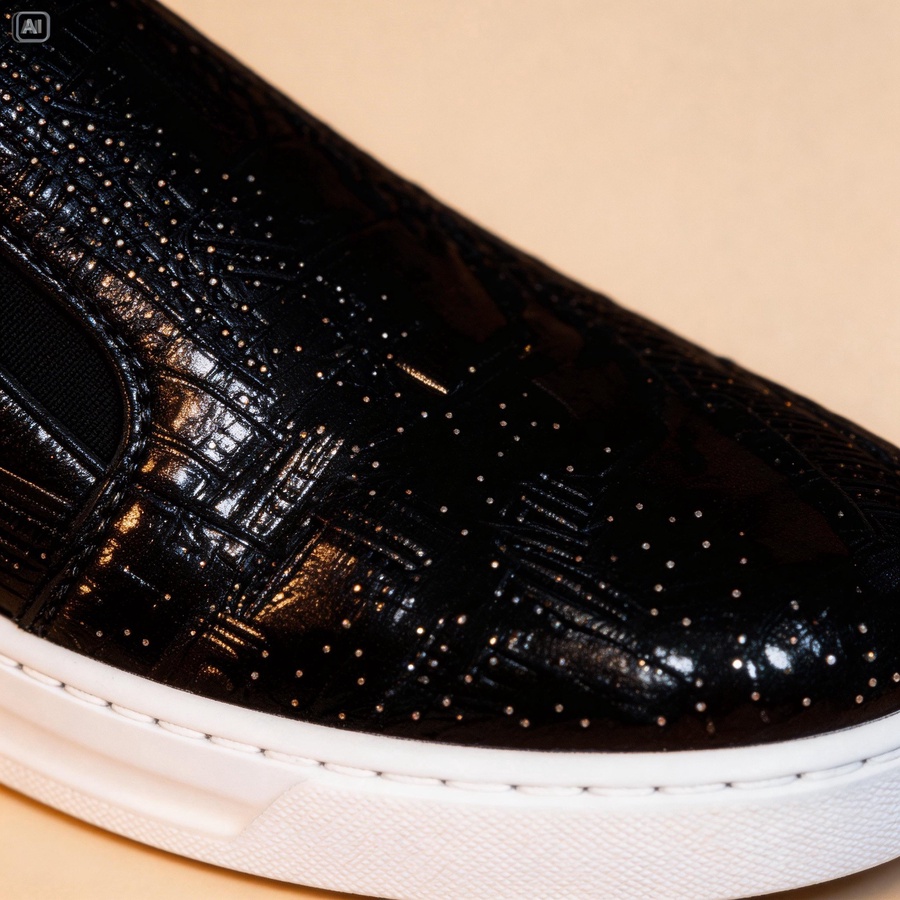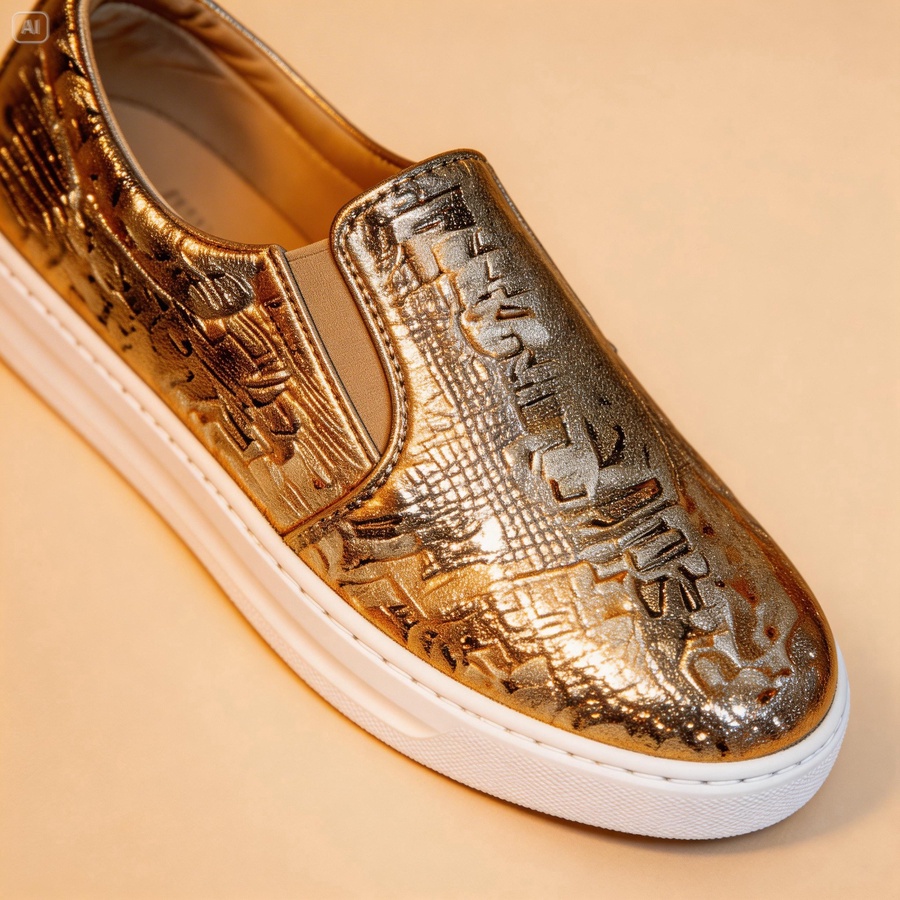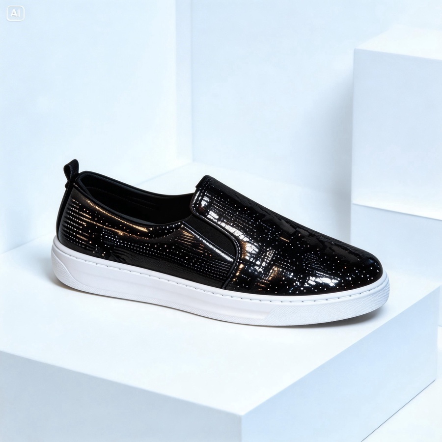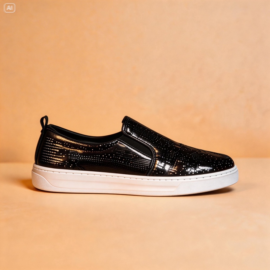 "حذاء سنيكرز سليب أون حريمي لامع من VART – مريح وأنيق للجامعة والخروج اليومي. متوفر بثلاث ألوان: أسود، ذهبي، فضي. اشتري الآن!"